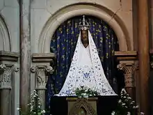 Originally, the sculpted clothes of the Virgin had a Romanesque polychrome decoration and her face was pale brown. In the 16th or 17th century, the statue was painted black, for an unknown reason. In 1945, this layer of paint was removed, revealing the original colours. However, a black tint was applied to the face only, to maintain the tradition. In 1963, this was removed, and the face returned to its original colouring. Now the statue can no longer be considered a Black Virgin — rather, it is a former Black Virgin.