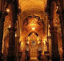 Inner view of the Church of São Francisco showing the gilt woodwork of altarpieces, ceiling and columns.