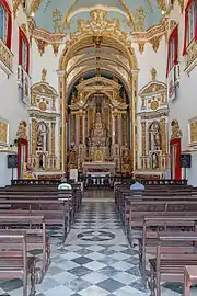 The high altar follows the design of the Italian Jesuit artist Andrea Pozzo (1642-1709). It is complemented by two altars at the corner of the chancel arch. Polychromatic marble is richly used in both the floor and elements of the high altar. An image of Our Lady of the Conception is at center of the high altar. A life-size statue of Saint Peter in full papal costume is placed to the right of the high altar; and image of Saint Paul is to the left. The church also has images of Santa Luzia, Saint Amaro, Saint Eligius, and Our Lady of the Gate of Heaven. The high altar and two side altars are in the Neoclassical style, with no trace of the baroque. And image of Our Lady of the Conception is at center of the high altar, and images of Saint Paul and Saint Peter below.[6][7][5]