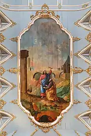 The painting on the ceiling of the nave depicts the Confession of Peter from the Book of Matthew; the scene is a reference to Matthew 16 where Jesus says "[a]nd I will give unto thee the keys of the kingdom of heaven: and whatsoever thou shalt bind on earth shall be bound in heaven: and whatsoever thou shalt loose on earth shall be loosed in heaven." The painting is attributed to José Rodrigues Nunes (1800-1881), the only named artist to work in the church; no written record of his on the nave ceiling painting exists, other than by oral tradition. The painting sits within a medallion with gilt tracings, in contrast to Baroque nave paintings in Bahia that cover the length of the ceiling. The nave ceiling has triangular vaults with elaborate gilt tracings above each opening to the tribune; each vault has an oval painting of an early benefactor of the church within.[8][1][3]
