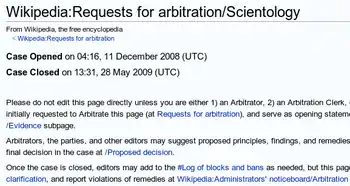 - Wikipedia Arbitration Committee (May 28, 2009). "Wikipedia:Requests for arbitration/Scientology". Wikipedia. en.wikipedia.org. Retrieved 2010-08-24.