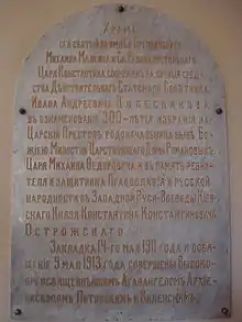 The Orthodox Church of St. Michael and St. Constantine (Lithuanian: Šv. Konstantino ir Michailo Cerkvė; Russian: Церковь Святых Константина и Михаила) is a Russian Orthodox church in Vilnius, Lithuania. It was built in 1913 to commemorate the 300th anniversary of the Romanov dynasty.[1] It was built by I. Kolesnikov, and incorporates the Rostov and Suzdal architectural styles. On its consecration day of May 13, the church was visited by the former royal figure Grand-Duchess Elizabeth Feodorovna. She was known at the time of consecration as Sister Elizaveta and is now a martyr within the Russian Orthodox Church.