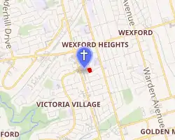 The Church of St. Jude is an historic church in the Scarborough area of Toronto, Ontario, Canada. St. Jude's was originally built in what was the small rural village of Wexford, Ontario in 1848. The original church building survives today, being used as the cemetery chapel, making it one of the oldest surviving churches in Scarborough. The land for the church was donated to Bishop John Strachan and the Anglican Diocese of Toronto by Patrick and Ann Parkin. They had used this corner of their farm as a family cemetery. The church was built atop a small hill, so that it dominated the surrounding landscape. The still operational cemetery surrounds the church, and has graves dating back to 1832. Local farmers built the church with lumber milled from nearby trees. The Gothic revival structure was designed by Reverend William Darling, the Anglican minister for Scarborough township. It is a replica in miniature of a church he remembered from his native Scotland. Keeping the proportions of the original while greatly shrinking the structure explains why the sacristy entrance is only five feet high. Darling's son, Frank Darling, would later become a prominent Toronto architect himself.