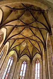 The church has a single nave and a polygonal choir. The buttresses which support the nave have niches and canopies for statues, though most have been removed. A small stair tower is built into the southern wall on the western end of the church.[1]