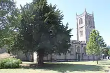 The Anglican parish church of St John the Baptist gradually evolved until taking its present general form during the reign of Charles II, after the spire over the north aisle collapsed into the building during a storm in 1632.[1][6] The current tower, built over the north-east corner of the nave, now rises in three stages over the Western entrance and is surmounted by a pierced parapet and short croketted pinnacles and is said to have been built from the ruins of the abbey church. Along with the new tower further restoration was carried out in 1634–1655,[4] this included a new pulpit.[7] Following the English Civil War in the 1640s the vicar Thomas Codrington received an increased stipend as part of the settlement imposed on the lord of the manor, another Thomas Bridges, for his support of the royalist cause. After the restoration of the monarchy Codrington appears to have revert to supporting the monarchy and persecuted the local quakers who had supported the parliamentary cause.[8]