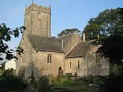The original 12th century chancel is located by the single-light window at the north wall, its internal stonework is original.[2] The west tower is in the Somerset style, similar to that of St John the Baptist Church, Cardiff, the oldest medieval church in the capital.[3] The tower stands as an exotic feature to the location with its features similar to those found in Cornwall and Devon, but rarely in Glamorgan.[2] The tower is of two stages with a stepped diagonal buttresses and polygonal NE stair. The tower contains a ring of six bells which were restored and rehung in 1994.[4]