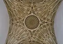 The tower arches at the crossing are slightly bent in their central sections, indicating potential problems with the tower in the past, and the need for the massive supporting buttresses.[12] Underneath the tower is a highly decorative stone fan vault, a hallmark of the Perpendicular Gothic style.[4]