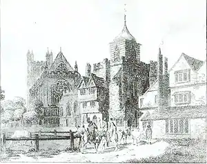 The earliest known form of a building on the site was a Roman bath-house, built 60–65 AD.[3] In the 7th century the Saxons built on the site of the bath-house a monastery or minster.[4] Saint Boniface (c.675–754), supposed to have been born in Crediton, Devon, was educated at Exeter Minster in 680, when the monastery of Escancastre,[5] or Examchester[6] was under the rule of Abbot Wulfhard. It was refounded circa 930 by the Anglo-Saxon King Æthelstan but was burnt down by Viking raiders in 1003.[7] It was rebuilt by King Canute in 1018. In 1050 the See of Crediton moved its seat to Exeter Minster, by licence of King Edward the Confessor, which was the founding of the See of Exeter.[8] After the Norman Conquest of 1066, in 1114 Bishop William Warelwast commenced the building of a new cathedral to house the See of Exeter, on the site of the present Exeter Cathedral, to the immediate north-east of Exeter Minster. The new Cathedral was completed circa 1220, whereupon the Minster was vacated by the Bishop, and was converted to a parish church dedicated to Saint Mary. The "Major" suffix appears to indicate a church of special status, as in the Basilica di Santa Maria Maggiore in Rome. It was demolished in 1865 in order to build a larger church to house the expanded population of the City, which new building was consecrated in 1867.[9] It escaped the bombing in World War II which so much of the City suffered, but was finally demolished in 1971,[10] being by then little attended by parishioners. Following the demolition several Saxon graves were discovered on the site, together with the foundations of the Roman bath-house and Saxon Minster.[11] The site is now a level grass lawn.[12]