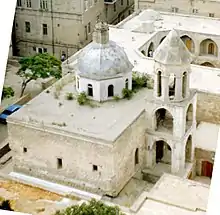 Since there were not many Armenians in the Old City compared to the rest of Baku, the church did not have a large parish. Therefore and because it has been erased from public memory in Baku,[1] little information has remained about it, and some statements about it are contradictory. According to Leonid Bretanitsky, the church was built near an Armenian caravansary beneath the Maiden Tower.[2] Benjamin Arustamyan states that perhaps already Hamdallah Mustawfi Qazwini (ca. 1281–1344) mentioned an Armenian church and that the Armenian church of Holy Mother of God (Surp Astvatsatsin) was built in 1799 (i.e. under Persian rule of the Qajars) at the foot of the Maiden Tower inside Baku fortress, and demolished in the 1930s.[3] However, the church stood until the Nagorno-Karabakh conflict, as can also be seen on several photographs.[4][1] It was the Armenian Saint Thaddeus and Bartholomew Cathedral in Baku that was really destroyed under Joseph Stalin.[5]