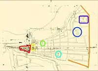 After a heavy fire in 1668 the walls of the posad were relocated to the east, and consequently the Spasskaya gate tower was moved from the Kremlin to the place of the burnt up Znamenskaya tower of the Ostrog walls;[5] today it would be lying between the crossroad of the Republic and Chelyuskintsev Streets. The new walls of the posad at the future Irkutsk Street (now the Chelyskintsev Street) stood undamaged until another fire erupted in 1766.[8] At the same time on a drawing of Tyumen between 1668 and 1695 from Nicolaas Witsen's book Northern and Eastern Tartaria and on a draft of the town around 1700, found by Golovachov in Gerhard Friedrich Müller's portfolio,[5][9] the All-Merciful Church is seen in the same area near the Kremlin.