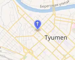 The first reliable account of the Tyumen Church of the Saviour comes from the 1624 Dozornaya book, which describes a wooden, "cold" All-Merciful Church in a posad.[5] It was located on the Market (Guest) square, near the walls of the Tyumen Kremlin.[6] Local historian Aleksandr Ivanenko assumes that it was named after the Spasskaya gate tower of the Kremlin,[3] from which started the Large Spasskaya Street (now the Republic Street).[7] According to Ivanenko, the church was located a bit to the left of a house at the Republic Street; that place is now swamped by the Tura River.[3]