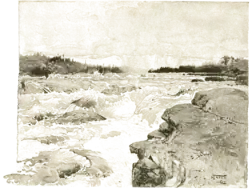 Fifty years later, the unmapped falls were sought as part of an 1891 scientific expedition to Labrador consisting of alumni and faculty from Bowdoin College in Maine. On July 26 a four-man party embarked in canoes heading westward from the expedition's schooner Julia Decker, but injury forced two of them to turn back. Austin Cary and Dennis Cole continued onward; after a 300 mile trek they reached the falls by foot on August 13.[8][9][10]