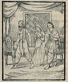 According to the narrative found in the Vana Parva (Ch.122-5) of the Mahabharata, Chyavana was so absorbed in practising austerities on the side of a lake that termites built up their mound all over his body and only his eyes were left. Once, Sharyati along with his army and the harem came to visit the place. Sukanya, daughter of king Sharyati, seeing only two bright eyes in what seemed to be an anthill, poked them with a stick. Chyavana felt excessive pain and became furious. He obstructed the calls of nature of Sharyati's army. He was pleased only after the king gave him his daughter in marriage.[10] Subsequently, the Ashvins came to the hermitage of Chyavana. They saw Sukanya while she was bathing and tried to convince Sukanya to reject old and ugly Chyavana and accept one of them as her husband. They also promised to restore the youth of Chyavana first so that she could make an unbiased choice amongst Chyavana and one of them. Sukanya rejected their proposal and informed Chyavana. Later, at the behest of Chyavana, Sukanya requested the Ashvins to do so. All three took bath in the lake and came out with the same youthful divine look. Each of them requested Sukanya to be his bride, but she identified Chyavana and selected him only. In gratitude, Chyavana assured the Ashvins that he will ensure that the Ashvins get shares of the sacrificial offerings.[11] Accordingly, Chyavana, while officiating as a priest of Sharyati in a soma sacrifice, offered the share of the sacrifice to the Ashvins. Indra objected it saying Ashvins are physicians of celestials, and are servants to them, so they have no right to receive offering of Soma juice. When Rishi ignored his opinion, he tried to hurl his vajra (thunderbolt) towards Chyavana, but his arms were paralysed by Chyavana, before he could do so. Chyavana by virtue of his ascetic energy, created a huge demon, Mada, with four fangs.[12] Mada was on the point of devouring Indra, when he became afraid and finally accepted the right of the Ashvins to have share of the offerings.[13]