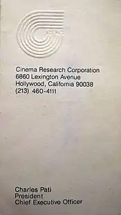 Cinema Research Corporation was founded in 1953 by Charles Pati from Brooklyn, New York. He moved to California at the age of 40 with the dream of getting involved with the film industry in Hollywood. By 1954, he had his first title, The Black Pirates, for which he created the special effects. By the end of that decade, he owned the largest special effects studio in Hollywood. His company, Cinema Research Corporation did titles, opticals, trailers, and special effects.[3]
