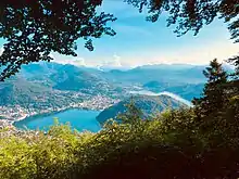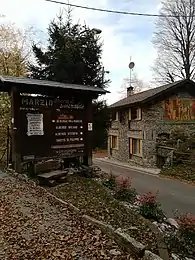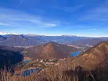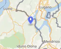 Mount Marzio is 878 meters high and on its moraine ridge sits the little Council of Marzio. From the top of the mountain, it is possible to see Switzerland and Lake Lugano.[30] The summit is accessible from two points of the village, the first one is immediately after the Madonna degli Alpini monument, the other is situated after Via Bolchini. It takes about one hour to get to the top of the peak. Remains of the trenches of the Cadorna Line are visible along this path.[31] On the top there are some antennas and two flat areas, and from one of these there is a viewpoint over Lake Lugano.[32] A geological fracture named "faglia di Marzio" sections the valley from north-west and separates Mount Marzio from Mount Derta and Mount Piambello. While Mount Derta and Mount Piambello are mainly made up of red porphyry and quartz, Mount Marzio is mainly composed of limestone of sedimentary origin.[33]
