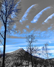 Mount Poncione is shaped as a pyramid and is 993 meters high. It appears as a wild spur detached from the ridge line that goes from Mount Monarco to Mount Piambello, descending steeply to Alpe Tedesco, with steep walls that border the Valganna valley. In the north-eastern part, steep woods descend towards Alpe Tedesco, whereas on the southern side a gentle crest connects it to the slightly higher Mount Minisfreddo.[25] From the top of Mount Poncione the view includes: the Valganna (Ganna Valley); the Ganna and Ghirla lakes; Campo dei Fiori di Varese; the lakes of the Varesotto (Lake Varese; Lago di Monate and Lago di Comabbio); Mount Martica; the Valceresio (Ceresio Valley); the Lugano Lake; Mount Minisfreddo; Mount San Giorgio; Mount Generoso; Mount Rosa; the Lepontine Alps and the Retiche Alps.[26]