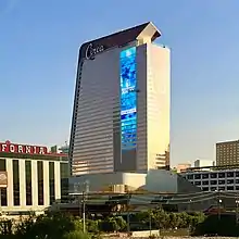 The Circa hotel tower was topped out on June 19, 2020.[24] The tower includes 175,000 sq ft (16,300 m2) of glass paneling.[25] The tower's north side features a giant video screen which promotes the resort. It was built by Daktronics, and measures 228 feet tall and 52 feet wide.[26] During construction, a minor error occurred on the west side of the tower's 30th-floor exterior. Mo Pierce, one of the project engineers, installed a white-colored glass panel in the wrong spot, making it stand out from the rest of the paneling.[19][27][28] By mid-2020, the mistake had gained an online following, and Derek Stevens said the misplaced panel was nicknamed as the "MoDot" and was used as a reference point: "(We'd say) plumbing is going on three floors below the MoDot, we're doing this above the MoDot. It became a noun, it became part of our regular vocabulary."[27] The MoDot was eventually removed, a few days after the resort's opening.[29] Circa was the first new hotel-casino to be built in downtown's Fremont Street area since the D Las Vegas, which originally opened as the Sundance in 1980.[2][30][31]