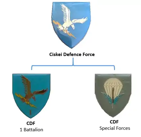 The Ciskei Defence Force (CDF) was established during March 1981 from the 141 Battalion of the South African Defence Force (SADF). It was the defence force of Ciskei, a bantustan that was controlled by the apartheid regime of South Africa. The CDF functioned as part of the 21 Battalion based near Lenasia, outside Johannesburg.[1]
