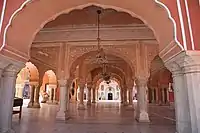The Sarvato Bhadra is a unique architectural feature. The unusual name refers to the building's form: a Sarvato Bhadra is a single-storeyed, square, open hall, with enclosed rooms at the four corners.[11] One use of the Sarvato Bhadra was as the Diwan-e-Khas, or the Hall of Private Audience, which meant the ruler could hold court with the officials and nobles of the kingdom in a more private, intimate space than the grand spaces of the Sabha Niwas in the next courtyard, which was open to more people. But it's also one of the most important ritual buildings in the complex, and continues to be so today, representing as it does, 'living heritage'. Because of its location between the public areas and the private residence, it has traditionally been used for important private functions like the coronation rituals of the Maharajas of Jaipur.
