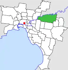 The origin of local government in the area dates back to 19 December 1856, when the Templestowe Road District was formed, following a public meeting and election at Bulleen Hotel.[2][3] Two decades later, on 7 May 1875, the Shire of Bulleen was formed, incorporating the Roads Board area and Warrandyte.[2][4] On 30 May 1890, the Doncaster Riding was severed and incorporated as the Shire of Doncaster, meeting in the old Shire Hall in Council Street.[2] By this time, fruit growing had become the mainstay of Doncaster's rural economy. The Shire of Bulleen was renamed to the Shire of Templestowe on 12 May 1892 and reunited with Doncaster 23 years later under local government reforms on 1 October 1915, with the combined entity named the Shire of Doncaster & Templestowe on 16 March 1926. Urbanisation was slow to reach the area, and the 1949 Australian Blue Book described the shire as "mainly undulating country with extensive views [and] some low, hilly ranges". Agricultural activities, such as fruit growing, dairying and sheep and cattle grazing, dominated the shire's economic life.[5] By 1955 the population of the area had grown with suburban settlement and a new Shire Hall was built.[2] On 28 February 1967, at a time of rapid suburban growth, Doncaster & Templestowe was proclaimed a City.[6]