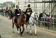 The City of London Police maintains a mounted police unit.[29] In addition to regular duties, the horses of the mounted unit have been used to trample wildflower seeds at the Barbican Wildlife Garden at the request of the community wildlife gardeners.[30] The horses' ceremonial duties include participation in Trooping the Colour and the Lord Mayor's Show; the City of London Police mounted unit also escorted the exhumed remains of King Richard III through the city of Leicester from St Nicholas Church to Leicester Cathedral, en route to their reburial.[31]