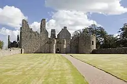 • Tolquhon Castle, four miles east of Oldmeldrum, Aberdeenshire, is a ruinous keep and courtyard castle.[22] The original castle was built by the Prestons of Craigmillar, but it passed by marriage to the Forbeses in 1420, and they completed the castle.[22] Sir Alexander Forbes, sixth laird of the castle, was killed at the Battle of Pinkie Cleugh in 1547.[22] The present castle was built by William Forbes, the seventh laird.[22] The tenth Forbes laird of Tolquhon saved Charles II of England's life at the Battle of Worcester in 1651.[22] In 1716 the Forbeses sold the castle to the Farquhars to help cover their losses in the Darien scheme, but the eleventh Forbes laird had to be forcibly removed from the castle by a detachment of soldiers in 1718.[22]