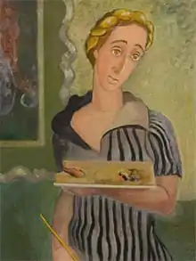 In 1923, Mairs and Haupers traveled to Paris where they studied sculpture with Antoine Bourdelle at the Académie Colarossi and painting with André Lhote at the Académie Montparnasse.[1] Mairs also briefly attended the Académie Julian. The pair toured Italy and spent a winter in Algiers before returning to Minnesota in 1925. They later frequented the Kettle River in Pine County, and created paintings of the people and landscape.[4] Mairs then turned her artistic energy towards printmaking before she and Haupers returned to Paris in 1928. She began experimenting with etching techniques and was influenced by Jean Lurçat's gros point panels. Her visits to the zoo inspired tapestries depicting white gibbons and zebras.[1] Beginning in Paris and influenced by her earlier work in textile design, Mairs created colorful five-by-six-foot wall hangings.[1]