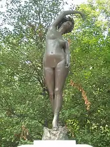 In St. Louis three of Garrett's large pieces could be seen at the Mary Institute, the Eugene Field School and McKinley High School. A fourth, posed by a St. Louis girl and named Carrie Kingsbury or Awakening of Spring (1902),[5] stands still today at the entrance of Kingsbury Place adorning the Union Boulevard gateway.[4] The Kingsbury piece took two years of work to Garrett and once unveiled, the sensual nudity of the girl caused such an uproar that Garrett used the $7000 ($219,235 in 2021 dollars) compensation to move to Paris. A number of smaller pieces were in many of St. Louis' finest homes. She was splendidly remunerated, busts bringing her $1,000 ($27,053 in 2021 dollars), and other pieces in proportion.