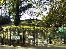 The New River Company constructed a forerunner to today's covered reservoir, Upper Pond, in 1709. Water was pumped up to the Upper Pond from New River Head. In 1855, the Upper Pond was drained, deepened and lined with tall walls, all buffered by tree-lined embankments. The natural views and much-buried walls of the structure mean it was Grade II listed in 2000.[lower-alpha 2][1] It is in use as part of London's inner Ring Main. Thames Water have exclusive access and take charge of repairs, cutting and planting, assisted by volunteer projects and residents' information. The street-side railings have a mixed set of pointed finials and form a neat, paradigmal archetype so are listed.[2][3]