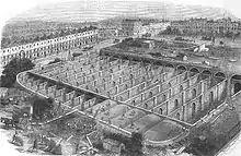 Claremont Square is a square in the Angel (Pentonville) part of Islington, London. Its central green mound, hiding a reservoir, is dotted with mature trees on all four sides (embankments). On its north side is Pentonville Road.[lower-alpha 1] It is lined on the south, east and west sides by early-nineteenth-century houses, and on the north side, across the arterial road, by heavily recessed apartment/office buildings. Many of the houses have been internally subdivided.