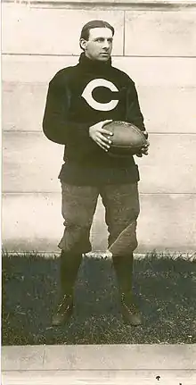 A native of Peoria, Illinois, Herschberger enrolled at the University of Chicago in 1894 where he became an honor student and graduated with Phi Beta Kappa honors.[1] He also earned a total of 13 varsity letters in track, football and baseball.[2] He played for Amos Alonzo Stagg's football teams from 1894 to 1898 and was one of the first of the great football stars developed by Stagg. He was captain of the 1897 Chicago team. Although he weighed only 158 pounds, Herschberger played fullback and was the kicker for Stagg's Maroons.[2] He was known for making key plays in big games. In 1896, Herschberger picked up a fumbled ball in a game against the Michigan Wolverines and ran it back for a touchdown to secure Chicago's victory by a score of 7–6.[3] In 1898, the Chicago football team played the Penn Quakers and lost 23–11, bringing national attention to Herschberger and Stagg's football team. Bob Sensenderfer of the Philadelphia Bulletin writes "I saw Herschberger play in that game. He sure could kick but it didn't do much good, for his ends couldn't get down to cover them and Penn's Johnny Gardiner got 'em back pretty well every time."[4] Famed football man Walter Camp saw the game and wrote, "Against Penn this year, Herschberger exhibited the best all-around kicking of the season; punting, place-kicking and drop-kicking with accuracy and facility."[5] After the 1898 season, Camp chose Herschberger as the first-team fullback for his 1898 College Football All-America Team—the first player from a western school to be so honored.
