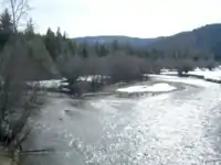 Clarkia is located in a flat meadow area which was created by the Miocene Epoch Lake Clarkia.[10] The sediments from this lake contain abundant and well-preserved fossils of mid-Miocene flora and are well exposed at the Fossil Bowl, an open-to-the-public fossil dig and motorcross racetrack located on Highway 3 in Clarkia. The West and Middle Forks of the St. Maries River join near Clarkia and run parallel to State Highway 3 in a northwesterly direction to St. Maries. The area is on the eastern edge of the Columbia River Plateau and is to the west of the Bitterroot Mountains.