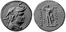 Euthydemus I was, according to Polybius[9] a Magnesian Greek. His son, Demetrius, founder of the Indo-Greek kingdom, was therefore of Greek descent from his father at minimum. A marriage treaty was arranged for Demetrius with a daughter of Antiochus III the Great, who had partial Persian descent.[10] The ethnicity of later Indo-Greek rulers is less clear.[11] For example, Artemidoros Aniketos (80 BCE) may have been of Indo-Scythian descent. Intermarriage also occurred, as exemplified by Alexander the Great, who married Roxana of Bactria, or Seleucus I Nicator, who married Apama of Sogdia.