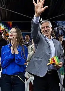 In February 2012, the couple announced that they were engaged.[4] On 8 September 2012, 24-year-old Fernández married 49-year-old García Linera in a ceremony which was broadcast nationally and internationally. The wedding was held with an Aymara rite in the Kalasasaya temple at the archaeological site of Tiwanaku.[12] Among those attending the event were Nobel Peace Prize winners Rigoberta Menchú and Adolfo Pérez Esquivel, as well as government officials, ambassadors, Aymara native authorities, representatives of social organizations, show business personalities, and dozens of other guests.[13] One of the first gifts the bride and groom received came from President Evo Morales, who hung a pink baby carrier on Garcia Linera's neck. According to Morales, this represented good wishes for García Linera's dream of "having a daughter" to come true.[13] The next day, on 9 September, the couple married before the civil notary, and later under Catholic rite in the Basilica of San Francisco, La Paz.[12]