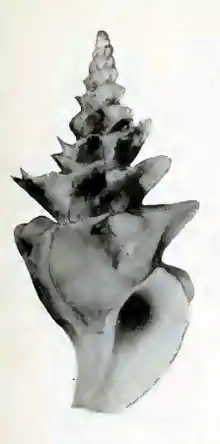 (Original description) The shell is moderately large and ovate. It is horn-colored, with the inside of the alations and the broad basal band white. The interior of the aperture is porcelaneous with a pinkish tinge. A part of the first turn of the protoconch whorl is lost. The remaining protoconch turn appears to be smooth. The early postnuclear whorls are marked by protractively slanting, axial ribs, of which 9 occur upon the first three whorls and 10 upon the fourth. On the first three whorls these axial ribs are quite regular, being strongest on the middle of the whorl and tapering toward the summit and the periphery. The spaces that separate them here are about as wide as the broad ribs. On the fourth teleoconch whorl they begin to be more oblique and tend toward the formation of a lamina at the tip. This becomes accentuated on the fifth whorl, and on the succeeding whorls it becomes increasingly more pronounced, gradually forming the broad winglike expansion that characterizes this species. There are 10 ribs on the fifth and sixth, 8 upon the seventh to ninth, and 12 upon the body whorl. These alations are marked by incremental lines, and their outside, as well as the base and columella, are crossed by slender, wavy, spiral threads. The insides of the alations are smooth, barring incremental lines. The aperture is moderately large and expanded, decidedly channeled anteriorly and at the posterior angle. The outer lip is thin, protracted between the posterior channel and slender stromboid notch anteriorly. The inner lip isreflected over the somewhat twisted columella as a heavy callus, which extends over the parietal wall and forms a slight lump near the posterior angle.[2]