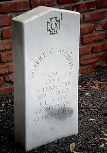 Robert A. Clay Allison[2] (September 2, 1841[3] – July 1, 1887) was a cattle rancher, cattle broker, and sometimes gunfighter of the American Old West. He fought for the Confederacy in the Civil War. Allison had a reputation for violence, having survived several one-on-one knife and gunfights (some with lawmen), as well as being implicated in a number of vigilante jail break-ins and lynchings. A drunken Allison once rode his horse through town nearly naked—wearing only his gunbelt. Later most reports stated that he was not only dangerous to others but himself, accidentally shooting himself in the foot.