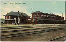 For many years, Cleburne was the site of a major locomotive backshop of the Santa Fe Railroad, and many shop buildings can be seen on the east side of the track. The 1898 two-story brick depot was scaled down to one floor and ultimately demolished during the 1990s to make way for a road expansion project.[3]