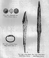 During his excavations John Smith unearthed a number of man-made objects such as a flint knife, spindle-whorl, bone spoon, bronze finger-rings, a stag's horn handle, spear heads, parts of a bridle, an iron battle-axe and a cut-glass emerald. Various bones were found, including those of beaver, sheep, hare, rabbit, cat, rat, dog, weasel, pheasant, partridge, duck, goat, ox, pig and goose. The seeds of fourteen species of plants were found, but none were from edible cereals.[5]