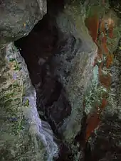 The word cove in Scots means 'cave'.[4] John Smith published a monograph entitled Cleaves Cove Stalactites and Stalagmites, published by Mr. Elliot Stock in which he provided drawings and a detailed description of these structures within the cave system,[5] many of which have been destroyed. The site was previously known as the 'Elfhouse' or 'Elfhame'[6] the locals at that time believed that these magical creatures had made this their abode.[7] Ness[8] calls the site Glen O'Dusk or the Elf-hame, the caves being the Elf-house.[9]