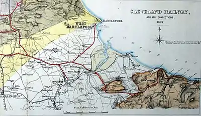 The West Hartlepool Harbour and Railway (WHH&R) and a number of landowners struck an agreement to construct a line from the Tees at Cargo Fleet via Normanby, Upsall and Guisborough to Skinningrove, with connecting links and branches to Staithes and Skelton-in-Cleveland. The line would connect to the WHH&R's own route north of the river via a crossing of the Tees. Several local landowners through which the proposed line ran were key to the scheme – Captain Thomas Chaloner of Guisborough, J.T. Wharton of Skelton Castle, Anthony Lax Maynard of Skinningrove and Ralph Ward Jackson of Greatham Hall, Normanby. Ward Jackson, who was the chairman of the WHH&R, was the driving force behind the project and envisaged making West Hartlepool into the industrial heart of Teesside.[3]