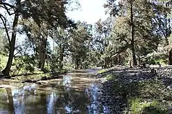 A thermal spring is located on the Belubula River near the caves. It is only one of three thermal springs associated with karst in NSW.[17] It was first recorded by Wilkinson in 1892,[18] and an analysis of the water appears in a report by Oliver Trickett in 1908.[19] Warm springs rising from Palaeozoic rock (as opposed to those from the Australian Basin) are rare in NSW with only three documented, all in karst areas. These are the Cliefden Warm Spring, a warm spring at Wee Jasper and the warm spring at Yarrangobilly Caves. There has been little study of warm springs in NSW.Despite assertions to the contrary, the Cliefden Thermal Spring is not on private property and is accessed via a public road.