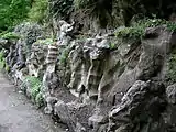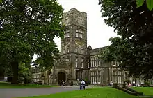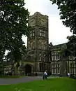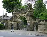 Cliffe Hall was built by Christopher Netherwood between 1828 and 1833, and designed by George Webster of Kendal, a gothic revivalist. The Butterfields, a textile manufacturing family, bought Cliffe Hall in 1848. Henry Isaac Butterfield transformed the building by adding towers, a ballroom and conservatories from 1875 to 1880, and renamed it Cliffe Castle in 1878. He decorated the building with the griffin motif, which he had adopted as a heraldic crest.[5] Sir Nicholas Pevsner describes the building as having an asymmetrically placed tower and Jacobean shaped gables.[6][7]