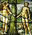 Neo-Gothic 19th century or earlier copy of Albrecht Altdorfer painted glass window featuring Adam and Eve. From West Riddlesden Hall, Riddlesden.