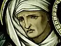 Detail of Dante as mourner from 1876 Crucifixion window by Edward Burne-Jones for Wm Morris. From St James Church, Brighouse. Possibly in homage to Doré who was in England in the 1870s.