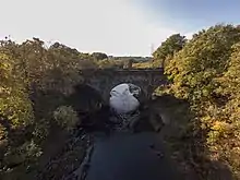 Clifton Aqueduct, built in 1796, carried the Manchester, Bolton and Bury Canal across the River Irwell in Clifton, near Manchester, England. It is preserved as a Grade II listed structure.[1] The aqueduct is constructed of dressed stone with brick arches. Three segmental arches with keystones rest on triangular-ended cutwaters. Above the cutwaters are flat Pilasters. A C20 brick parapet remains on the eastern side. There is a towpath on each side, and the aqueduct contains grooves for stop planks to be inserted, to drain the canal.[1] The aqueduct was engineered by Charles Roberts and John Nightingale.