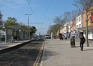 Clifton Centre is a tram stop on the Nottingham Express Transit (NET) network in the city of Nottingham suburb of Clifton. It is situated on street track within Southchurch Drive, and comprises a single island platform situated between the running tracks. The stop is on line 2 of the NET, from Clifton via the city centre to Phoenix Park. Trams run at frequencies that vary between 4 and 8 trams per hour, depending on the day and time of day. To the south of the stop, a reversing siding is located between the running tracks, allowing trams from the city centre to terminate at Clifton Centre and stand clear of through services.[1][2]