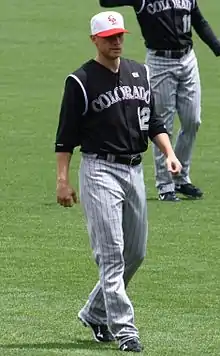 On Opening Day at Coors Field, Barmes hit a game-winning, walk-off home run off Trevor Hoffman of the San Diego Padres, becoming the first Rockies rookie to hit such a home run.[1] At the end of the month, MLB selected Barmes as the National League Rookie of the Month for April.[2] Barmes, who hit .410 with four home runs and 14 RBIs, also became the third player in MLB history to hit .400 or better in March/April, joining the New York Mets' Willie Randolph in 1980 and Montreal Expos' Andrés Galarraga in 1986.[2]