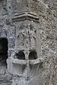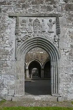 The great west doorway features many carvings, including Michael the Archangel with a sword and the scales for weighing souls; Saints Augustine of Hippo, Catherine of Alexandria and John the Baptist; a pelican feeding her young; a pair of griffins; and a mermaid with a mirror. The mermaid is similar to one at Clonfert Cathedral,[10] while the doorway is similar to the one at Clonmacnoise. The inscription reads MATHEV DEI GRA EPS CLONFERTENS ET PATRE ONEACDAVAYN CANONIE ESTI DOMINE FI FECERT ANO DO MCCCCLXXI (Matthew by the Grace of God, Bishop of Clonfert, and Patrick O’Naughton, canon of this house, caused me to be made in 1471); the bishop referred to is Matthaeus Mág Raith, the only Augustinian to hold the see of Clonfert.[11]