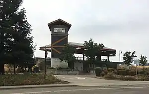 A rail station previously served Cloverdale along the original Northwestern Pacific Railroad, and was listed on the National Register of Historic Places in 1976 as Cloverdale Railroad Station. Train service began in 1872; the station was 82.5 by 32.3 feet (25.1 m × 9.8 m) in plan, of a "never numerous" but important rural railroad station type.[3] That station, however, was destroyed in a fire in 1991.[4] The rail line was rerouted to its current right of way to make room for U.S. Route 101 and the current station was built in 1998 with the anticipation of future rail service.[5]