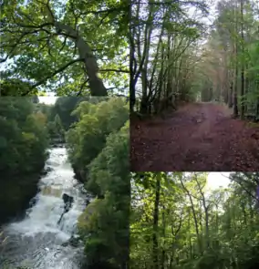 ![]() Clockwise, from top left: 1) an oak tree at Cartland Craigs; 2) one of the walkways at Chatelherault; 3) dense woodland at Cleghorn Glen; 4) Corra Linn within the Falls of Clyde. | |